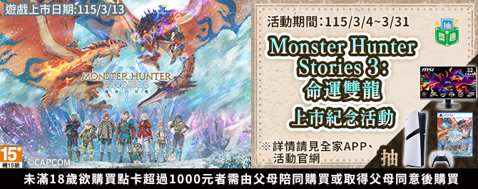 立刻獲得: 🎁《Monster Hunter Stories 3》遊戲道具序號小白單 (單筆交易最多送 2 組)
