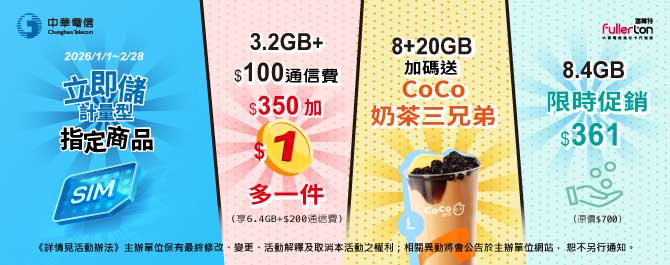 - 8GB + 20GB 再送 CoCo 奶茶三兄弟(L)